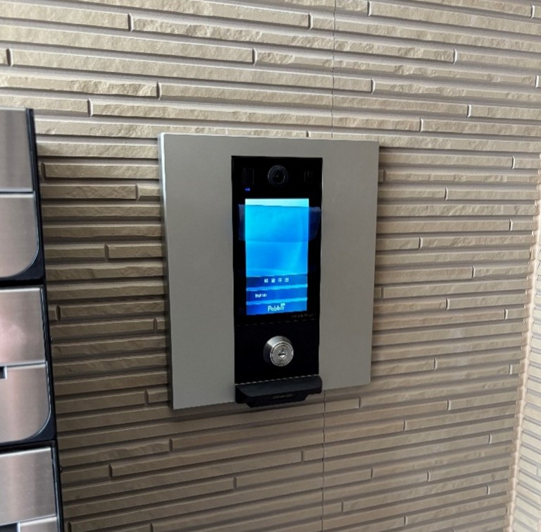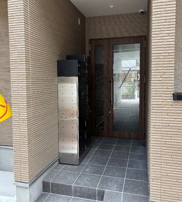 エントランスには、ポスト・宅配box・オートロック制御板・防犯カメラ・館銘板が設置されました!