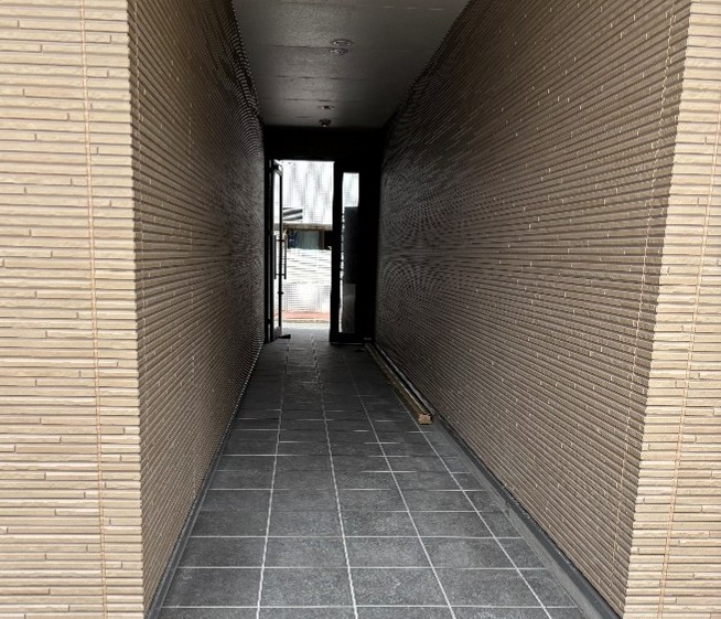 エントランスは建物の中心に配置されています。共用廊下までの通路もタイルの色がシックで雰囲気も良いですね🔳🔳