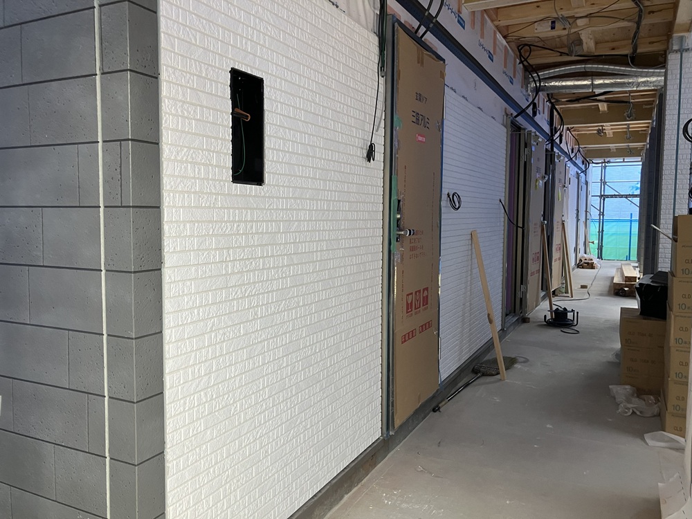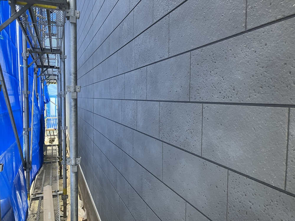 まだ足場やシートで囲われている状態ですが、サイディングが貼られ始めると