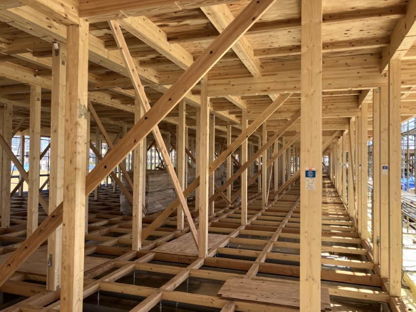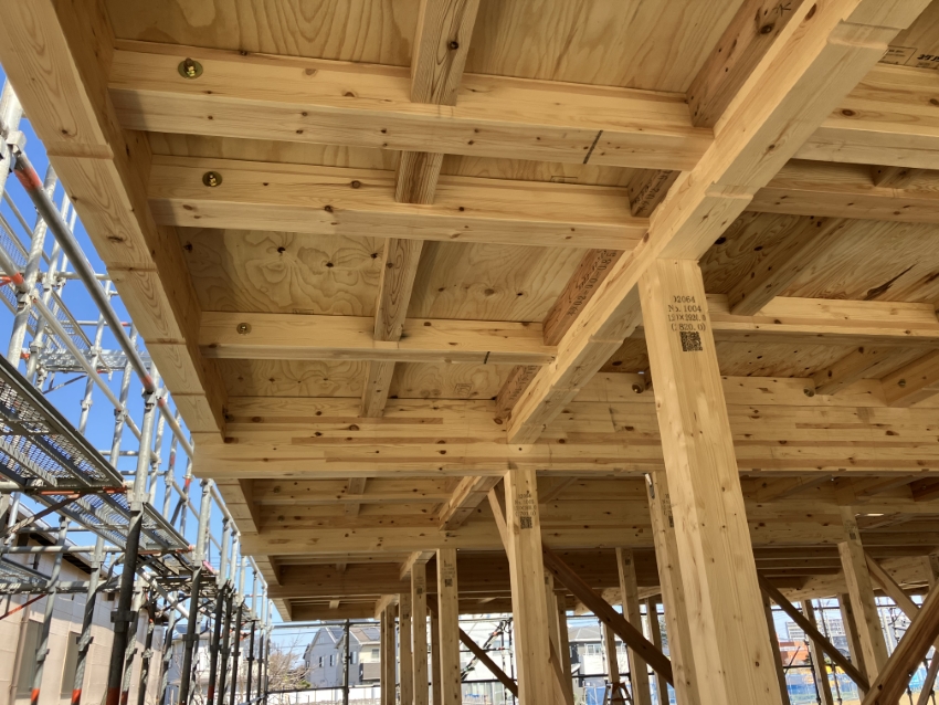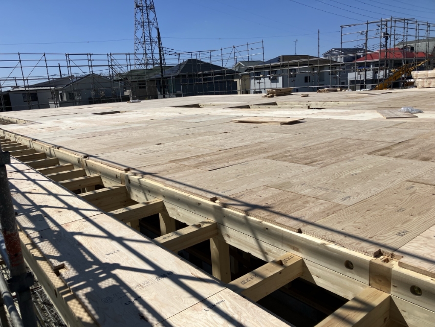 1階部分の躯体が組み終わった後は2階の床板を張っていきます。
