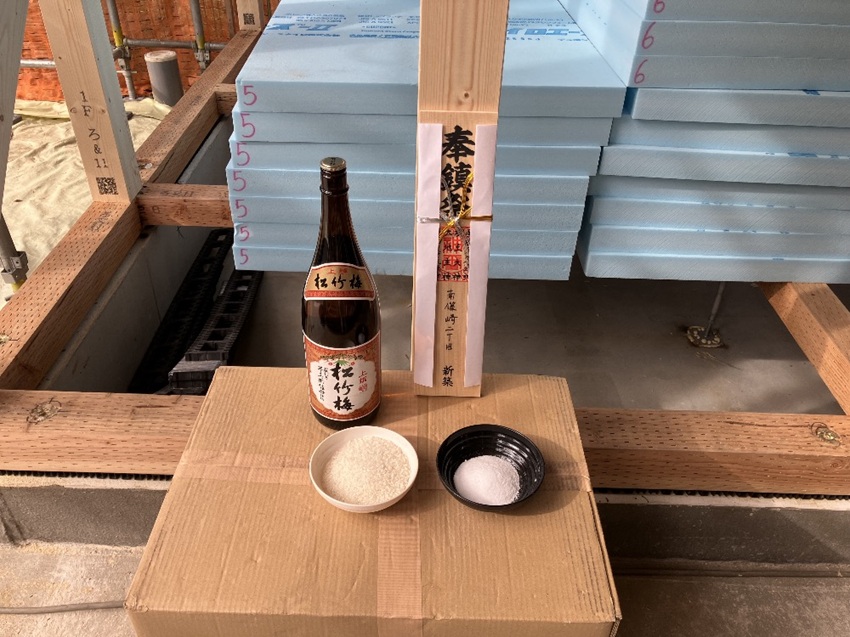 建物の四方に酒、塩、米をまいて、工事の安全を祈願します😌