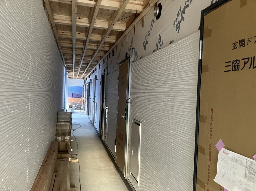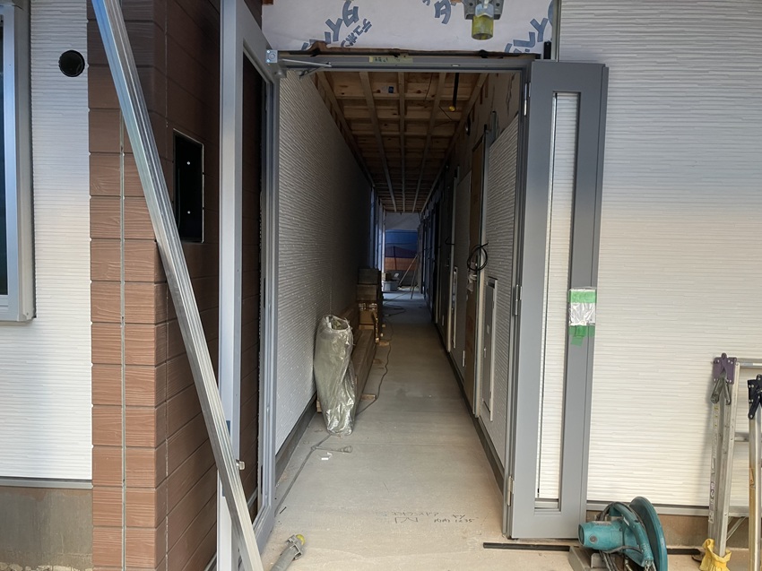 玄関扉が設置され、サイディング張りの真っ最中です!