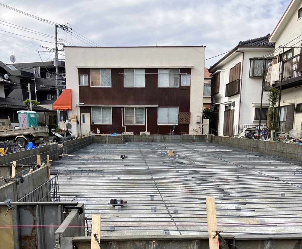 型枠にコンクリートを流し込んで、鉄筋を敷いて完成したところです!