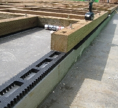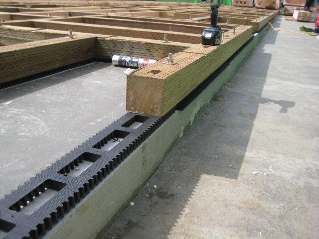 床下の通気確保のためのパッキンを置き、その上に防腐処理された土台を敷きます。