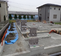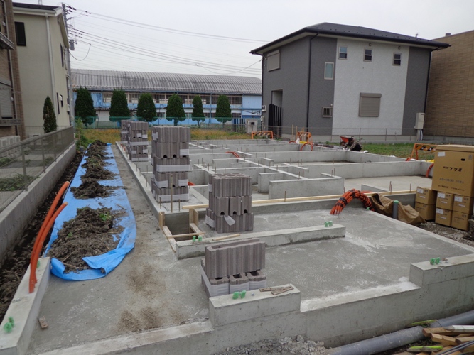 基礎工事を終え、外構のブロックを積んでいます。