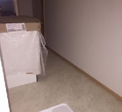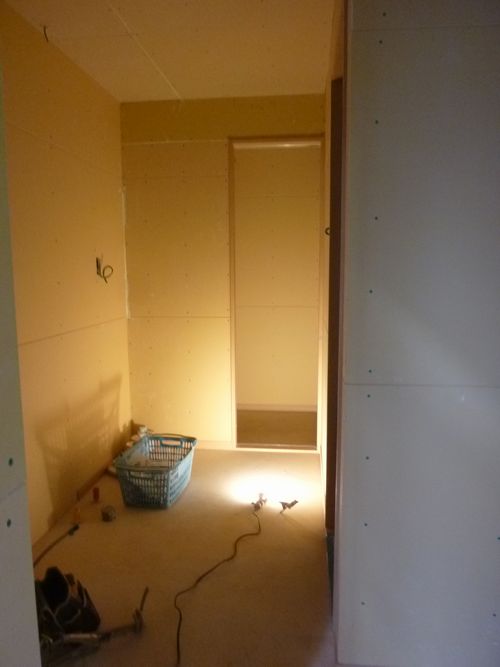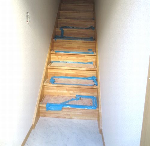 3枚目はこの前ご紹介しました202号室の階段になります。電気がまだ設置されていないので暗いですが、階段にも荷物が置ける幅になっていますね。