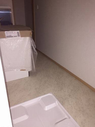 さらに廊下のタイルも設置されていましたのでご紹介いたします。まだ電気がついていないため少し暗いですが、白地に黒の模様がはいっているタイルになります。大理石みたいでステキですね!