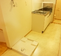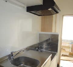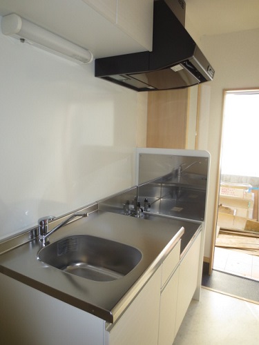 そのまま部屋にはいりますと、キッチンが設置されています。写真ですと分かりにくいですが、上部にも収納スペースがあり物が増えたときにも対応できるようになっております!