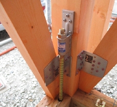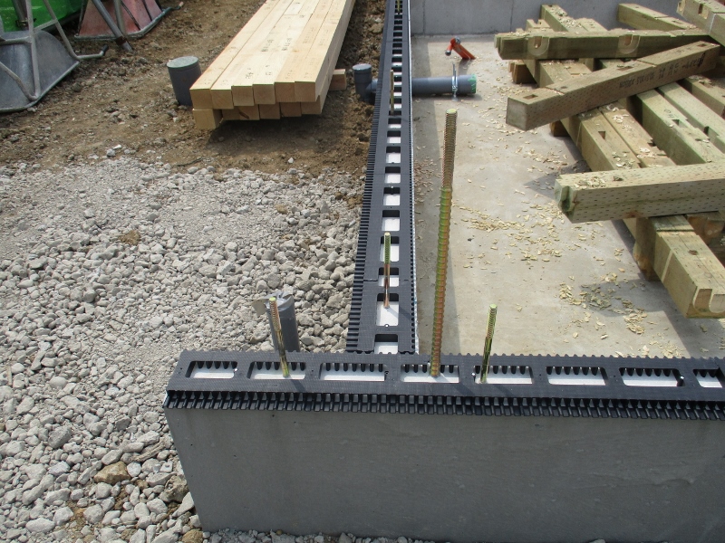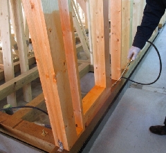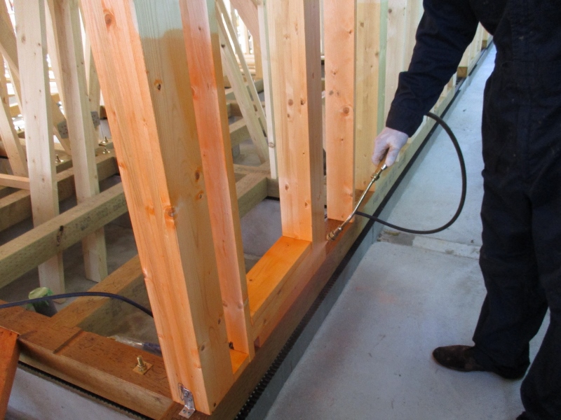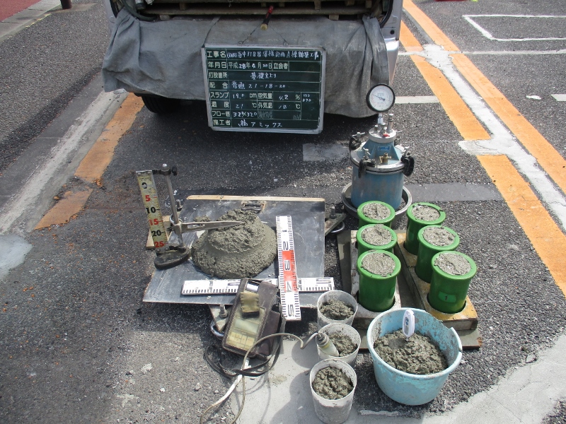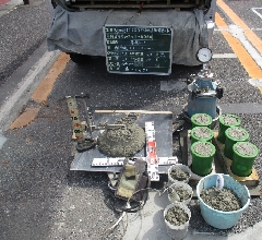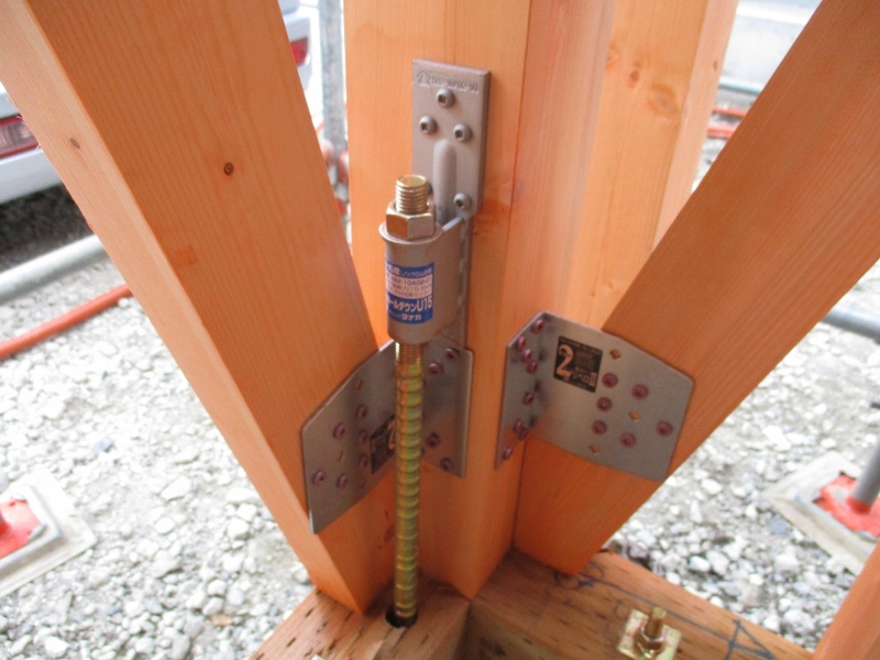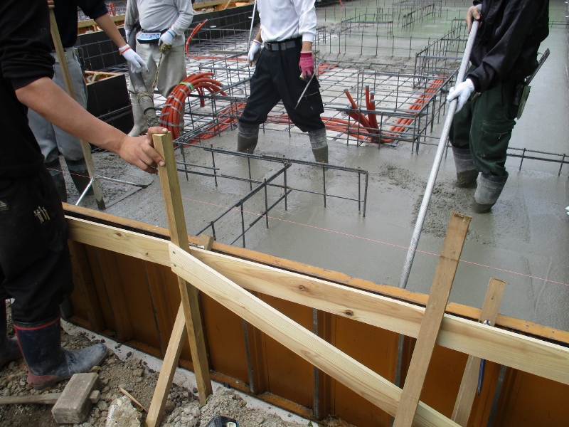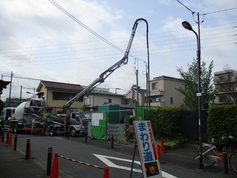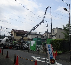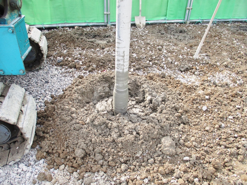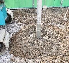 写真に写っている柱を地中に埋め、地盤の強化をはかります。