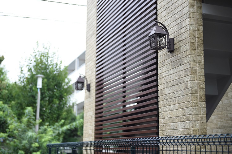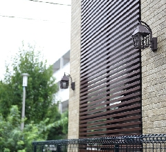 外壁とライト、木のアクセント