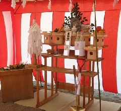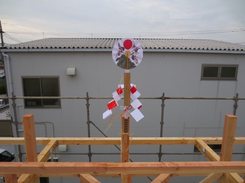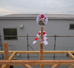 木造軸組では棟木(ムナギ)を棟に上げる時期に行われます。