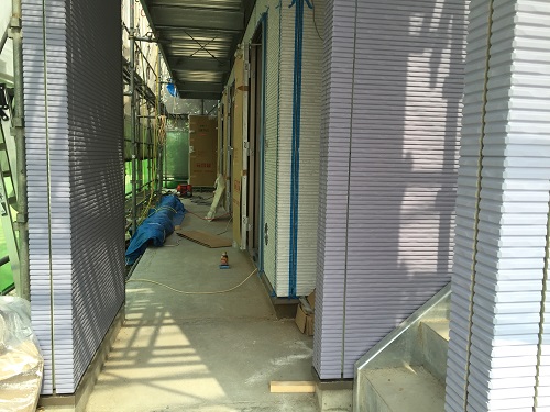 しっかり足場も組まれ外壁も徐々に出来上がっております。チラッと共用部の写真を載せます!白の外壁がみえてますね。