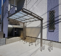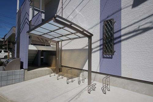 ゴミストッカーの設置や駐輪場の屋根、1階廊下へと続く階段も出来上がってきてますね。