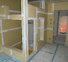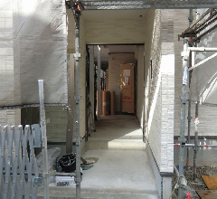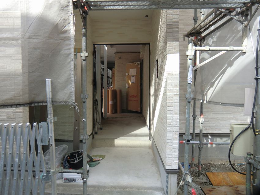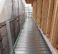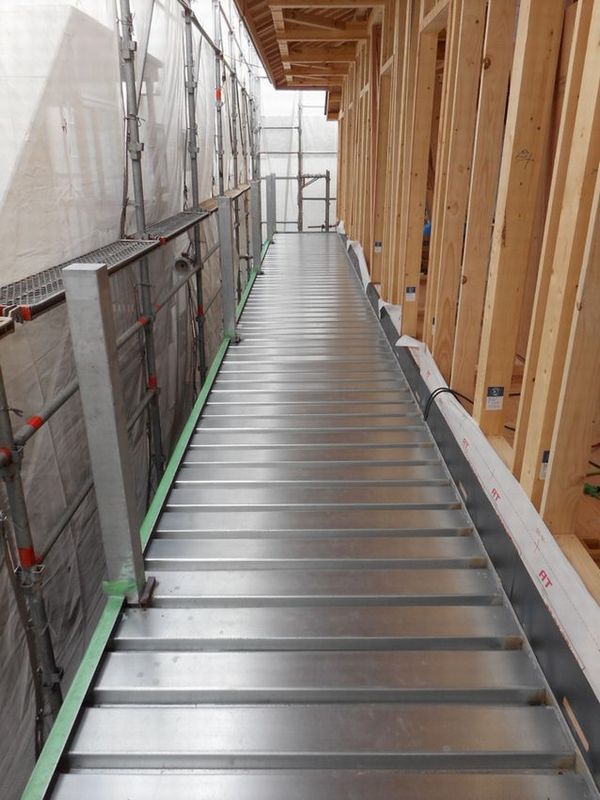 廊下の施工がもう少し進むと歩行用シートが張られます。