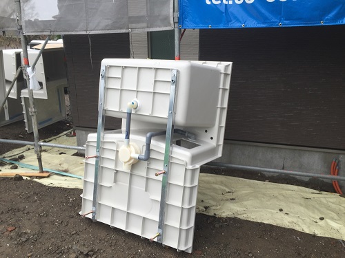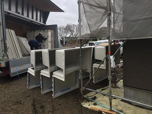 正解は《ユニットバス》です!!ユニットバスが搬入されている現場に立ち会いましたので写真でご紹介させていただきます。バスタブだけではなく、床も一緒にくっついているのですね。
