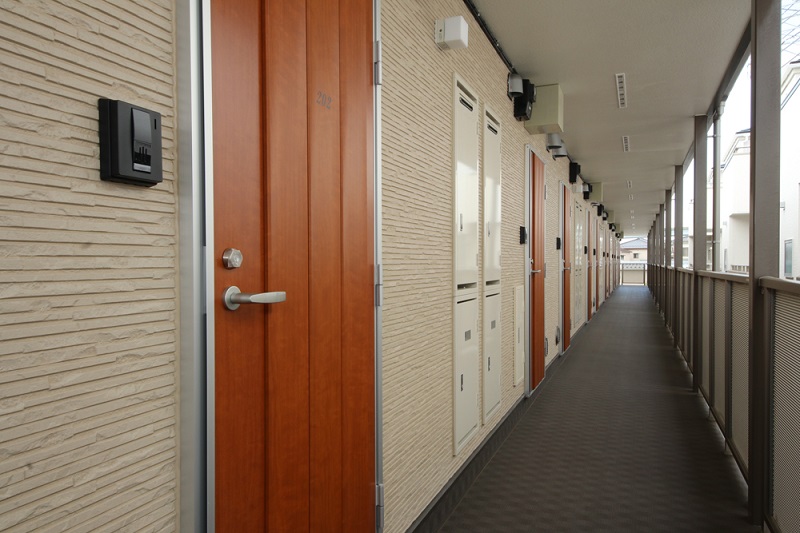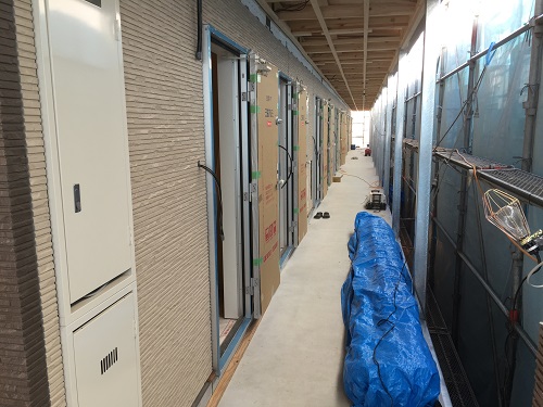 こちらは共用廊下になります!すでに各部屋に扉も設置されています。どんな色の扉なのか楽しみですね