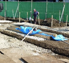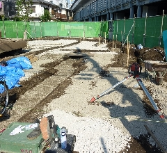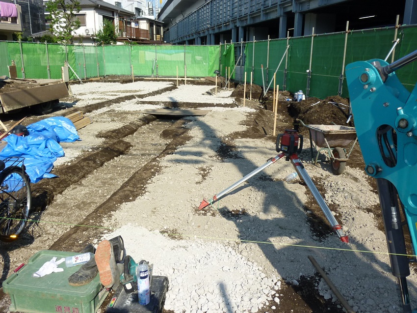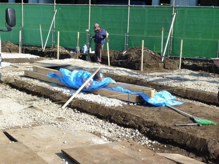 「根切り」とは、コンクリート基礎の形に合わせて土を掘る作業をいい、建築用語では「掘削(くっさく)」とも呼びます。この作業で重要になるのは、掘る深さと大きさが設計通りになっているかということです。