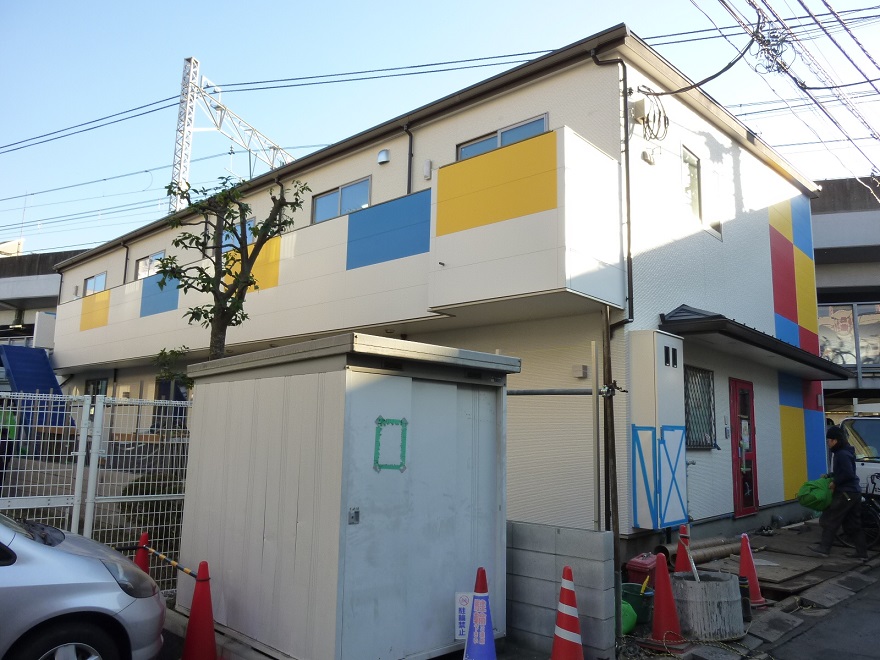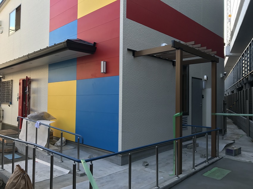 2枚目は横からの写真になります。こちらにも黄色と青色を使うことで、普段建築しているアパートとは全然違う印象をうけました