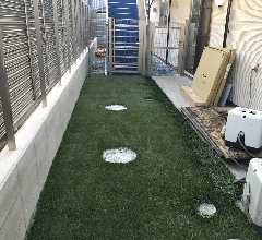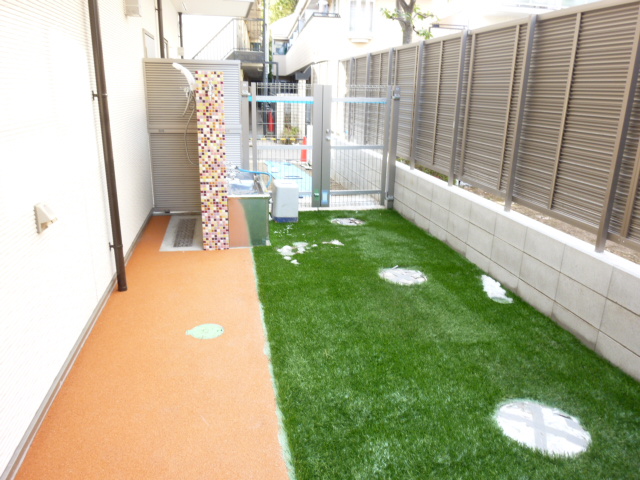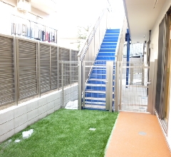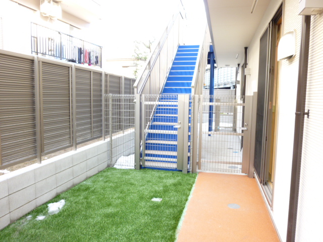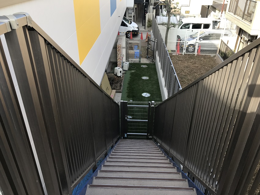 2枚目は前回ご紹介した避難経路の階段を下りたところにある芝生のお庭になります