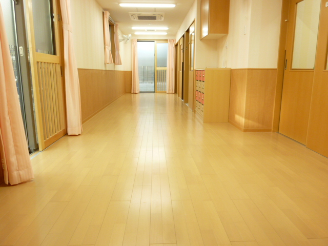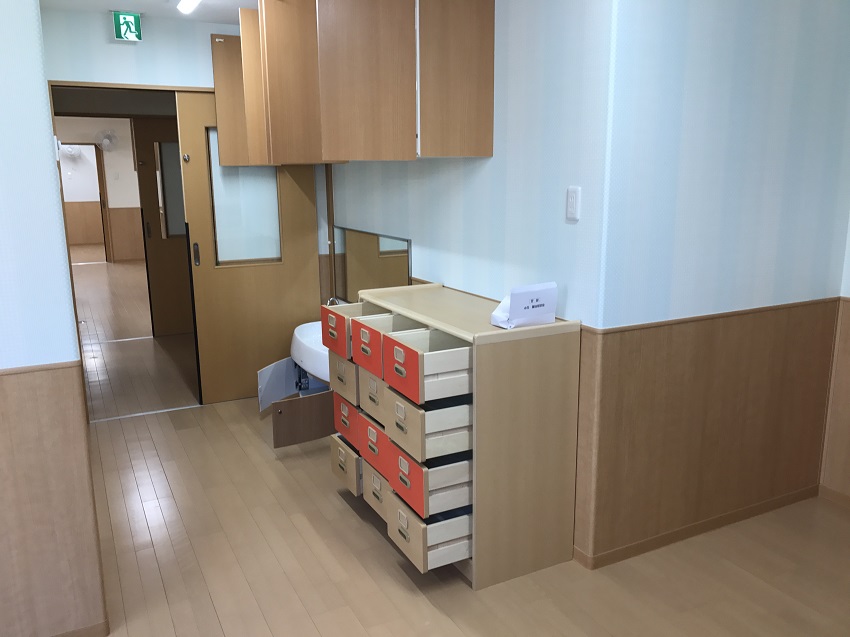 床の素材も、明るい色を使用しておりますまた木目調の腰壁なので、木のぬくもりが感じられる様な暖かい仕様になっております