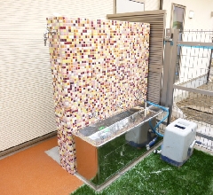 手洗い場の仕切りになっている壁のタイルがとても印象的です