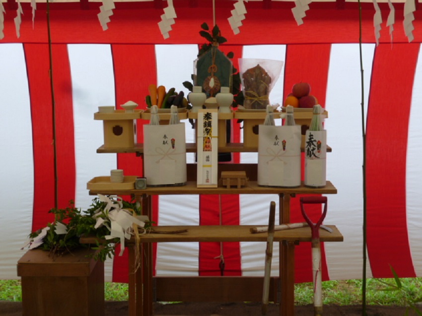 奉献酒や野菜等をお供え物として準備をして、お祓いをして、最初の鍬や鍬入れをします。