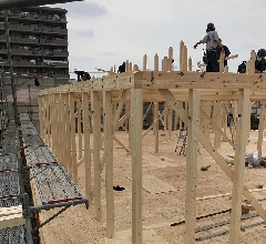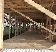基礎工事も完了し、躯体工事の様子になります今回は木造の保育園になるので、木で骨組みを組んでいきます。