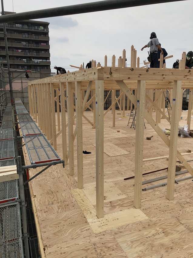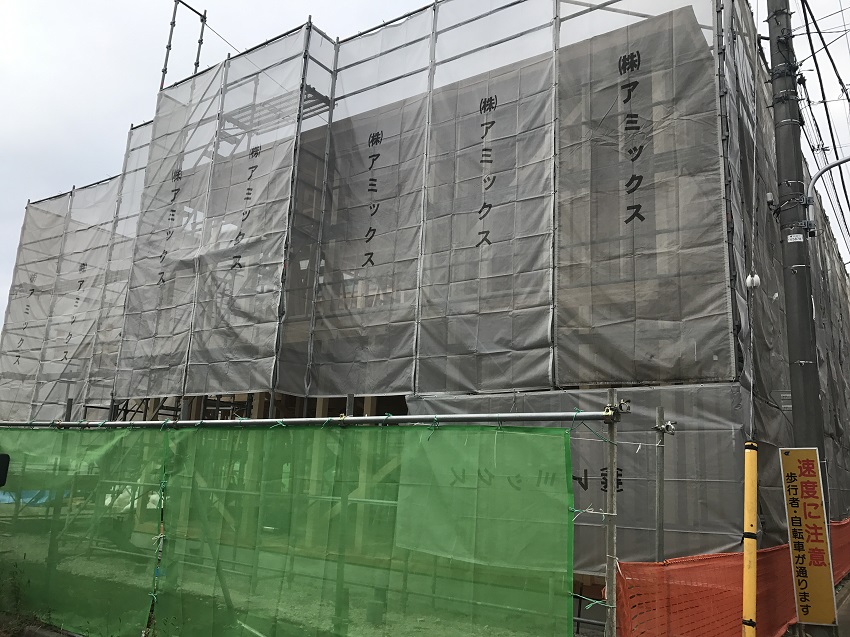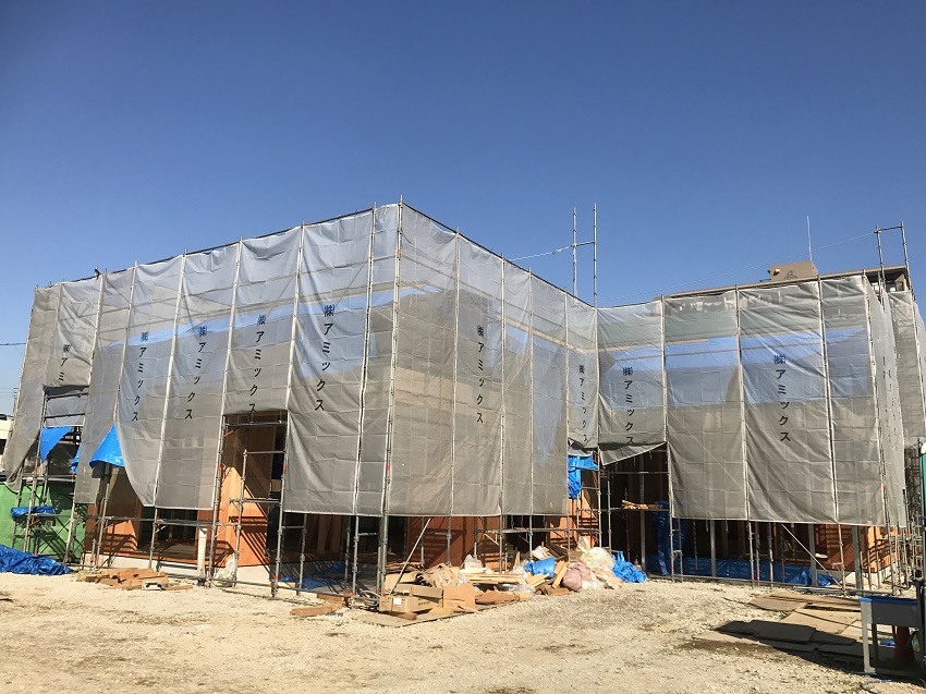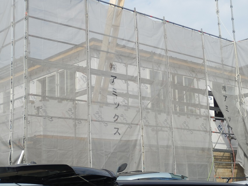 こちらは、上棟して足場がかかり木工事が始まりました上棟とは前回の更新の際にご紹介していた建物の骨組みの工事が完成した時のことを指します。上棟では上棟式という祭事を行う現場もあります。上棟式では、骨組みまで無事に完成したことへの感謝と完成までの工事の安全を願います。