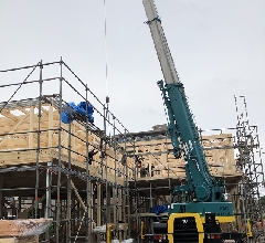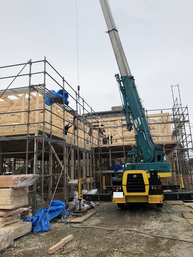 2階の部分の骨組みとなる木材はクレーンで持ち上げて運びます。