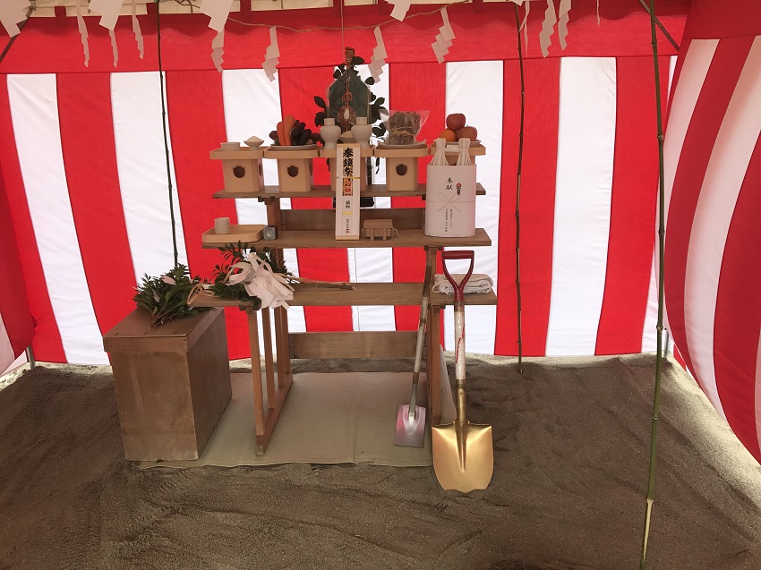 地鎮祭とは、建築を始めるにあたり土地の神を祭り、工事の安全を祈願する祭事になります。