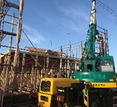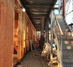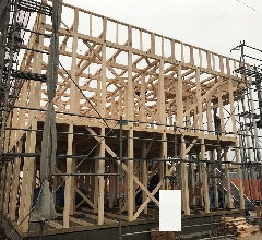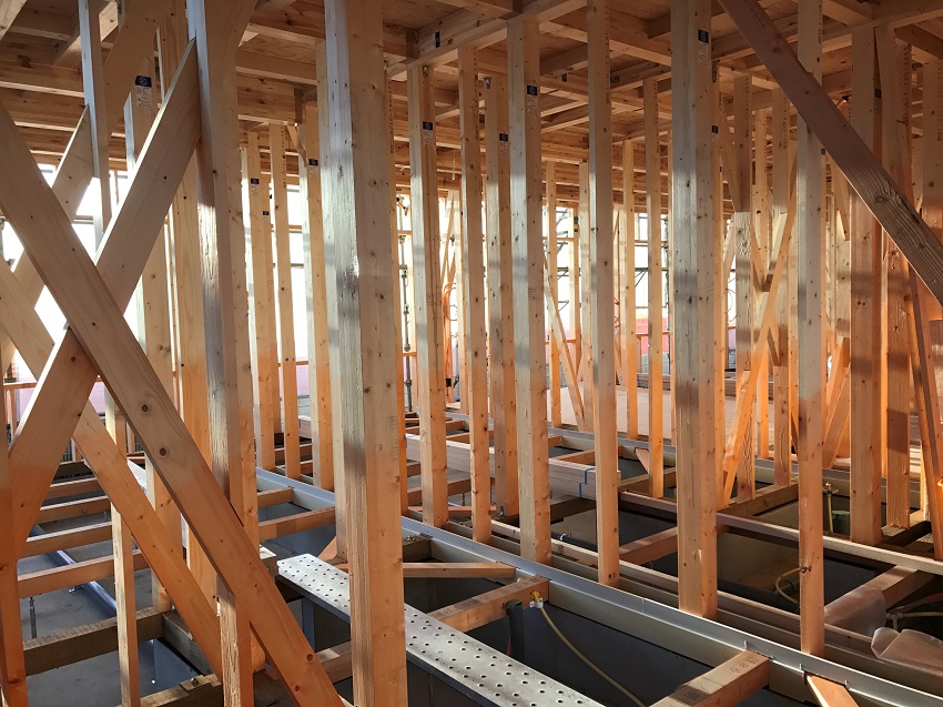 今回は建物の中側に潜入して、写真を撮りました!まだ外壁がついてないので、木材がそのままむき出しになっていますね!この木材も建物が完成してしまうと一般の方はなかなか見ることがないとおもいますので、撮影しておきます!