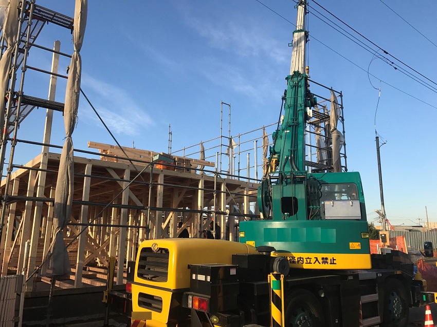 2枚目は翌日の12月11日の写真になりますが、驚くことに2階部分がほぼ出来上がっております。上棟の際は、短期間で一気に組み立てをしていくそうで、現場にはたくさんの職人さんが集まります。