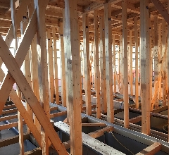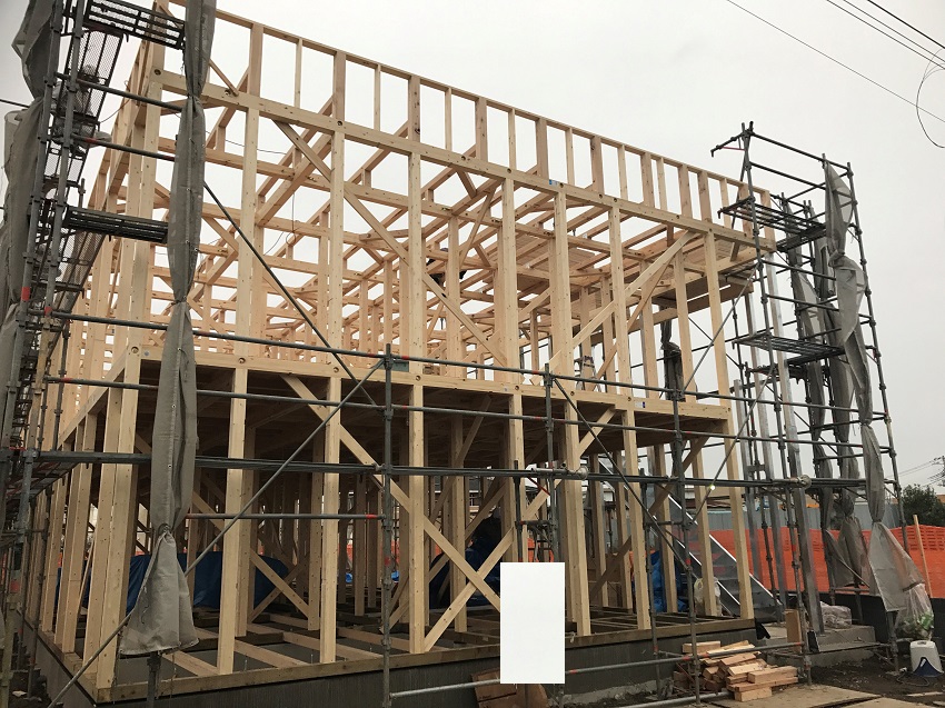 さて今回は上棟までの2日間の写真を投稿します1枚目は12月10日の写真になります。写真を見ていただくと、1階部分の木工事が出来上がり、その上に2階部分の木材が積まれている写真になります。