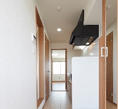 玄関や廊下、キッチンも居室と同様、ホワイトと茶色の木目調で統一しております
