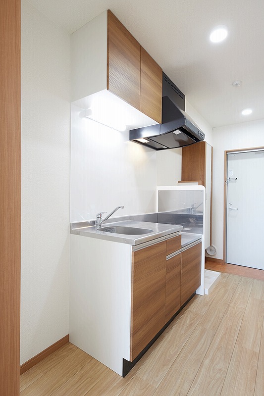 2枚目の写真はキッチンの写真になります。キッチンには収納がたくさんあるので、とても便利ですね!また換気扇でなく、レンジフードにしたことで汚れも目立たないので見た目もキレイですね