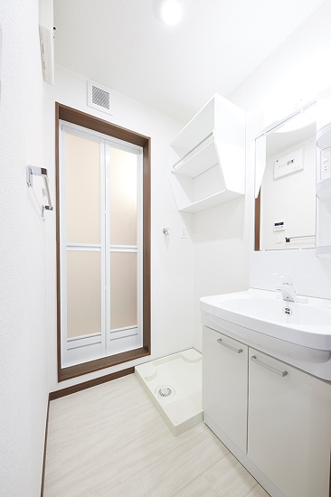 洗濯機置き場の上の吊り戸やタオル掛け、キッチン周りの小窓など、大きな変更ではないものの、あると便利なものを配置しています。
