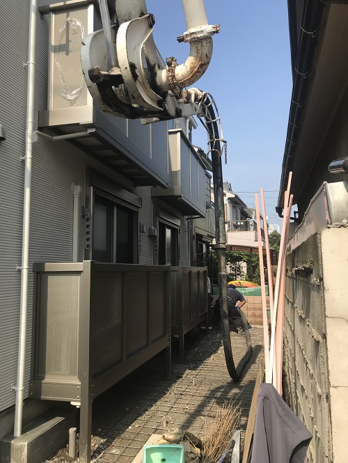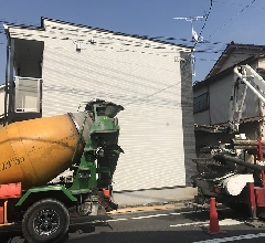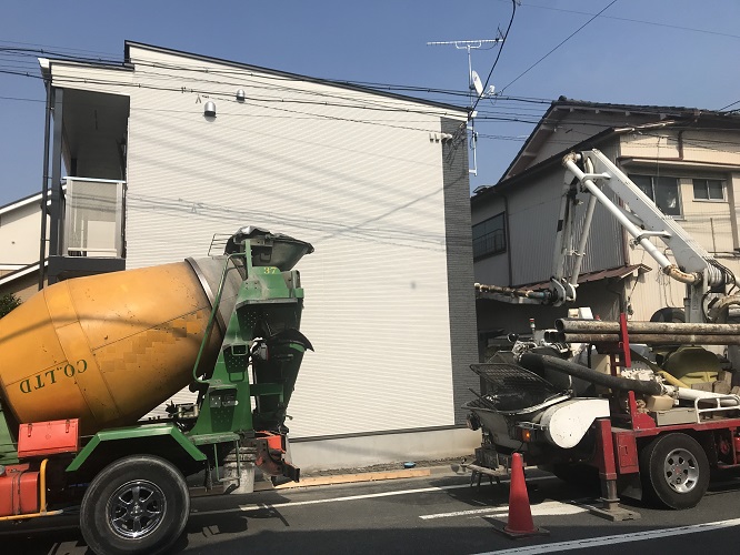 コンクリートを運んでくる車とそれを流し込むための車が連携しながら作業を進めていきますが