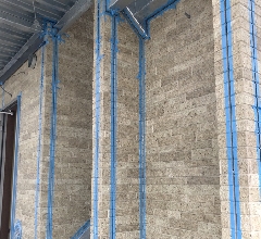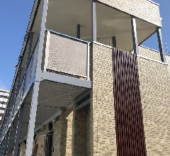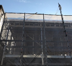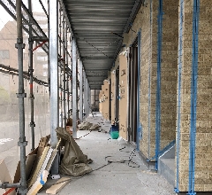 メッシュシートに覆われている廊下の写真は