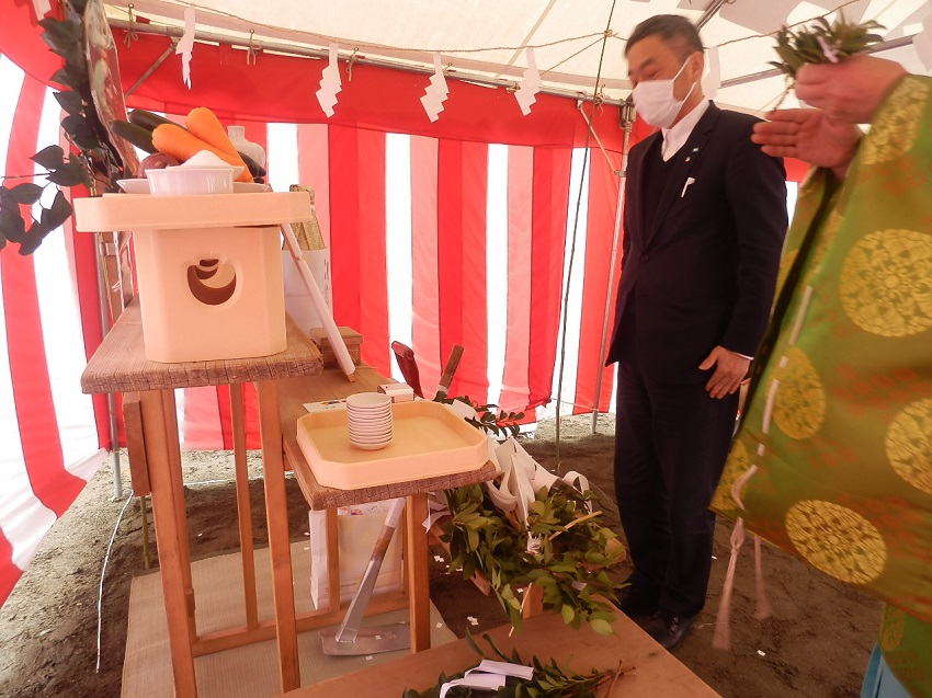 3枚目の写真は弊社社長の末永になります。施主様や現場監督、弊社の社員も一人ずつ玉串奉奠(たまぐしほうてん)し、工事の安全を祈願しました。