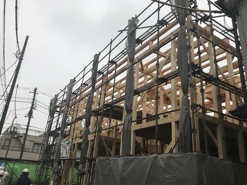 この後は、外壁工事が始まります。この木の骨組みは今が見納めですね