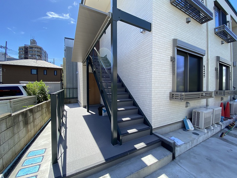 階段は錆が出にくいようにメッキ合金を使っています。長く入居者様にご利用いただけるようにいい材質を使っています