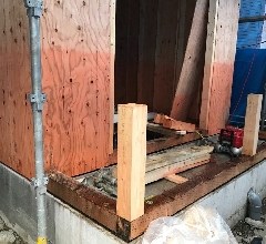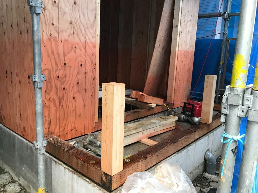 立ち上げとは残りの配筋の部分を木で囲いコンクリートを流し込む型を作る工程です。上物の配管や部屋の形に添うように作業を行います。