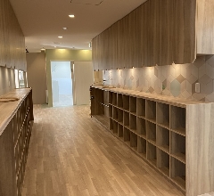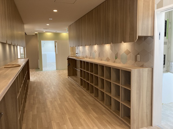 園児用のロッカーがある廊下はウッド調になっていて、木の温かみがあります。