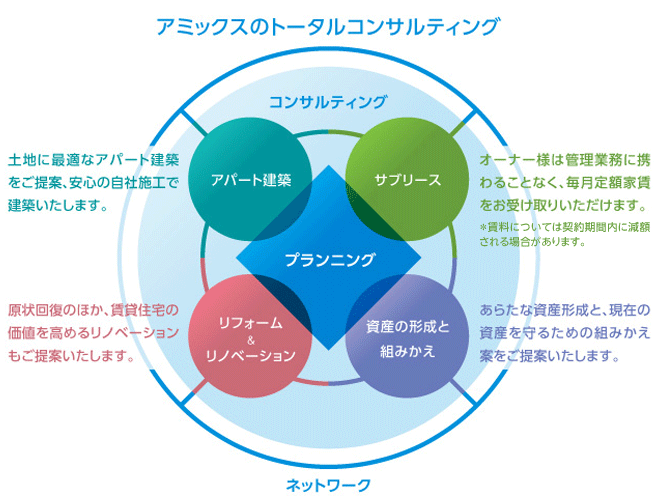 アミックスでは、土地の有効活用や不動産売買などを通して、オーナー様の大切な資産を活かすためのお手伝いをしています。建築や管理、売買をはじめ、リフォーム・リノベーション、資産の組みかえなど、社内外の幅広いネットワークでオーナー様をサポートいたします。ご相談には各分野の専門家がきめ細かく対応、オーナー様のご要望を伺いながら、最適なプランをご提案いたします。