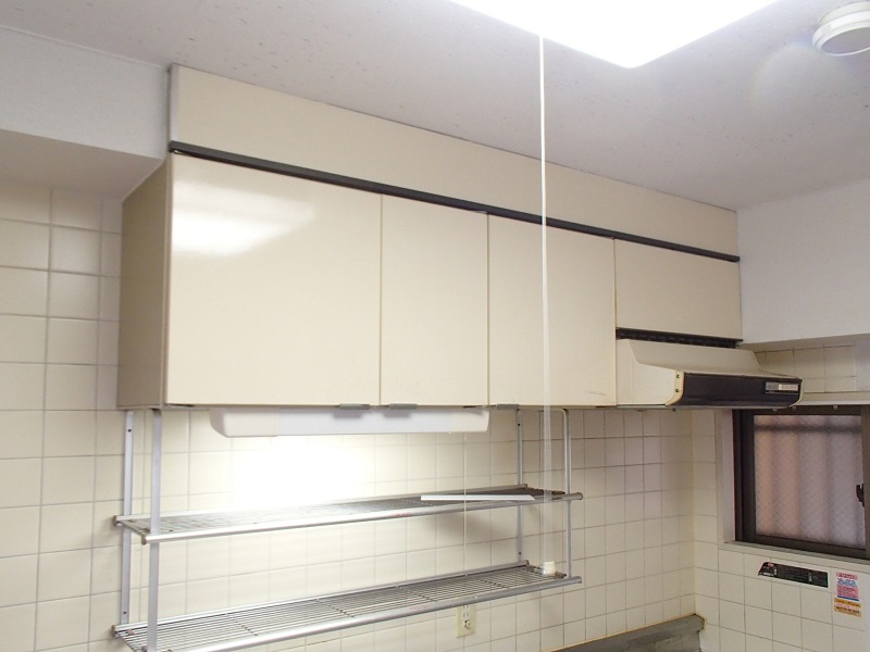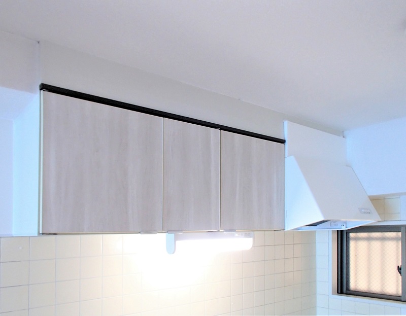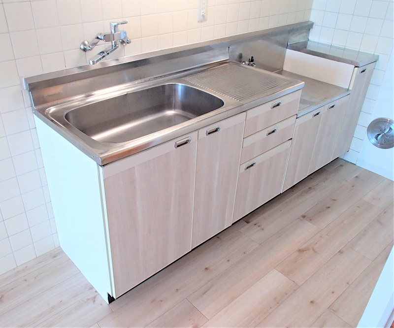 キッチンには背面タイルの色とも調和する 柔らかな色合いの面材を貼りました