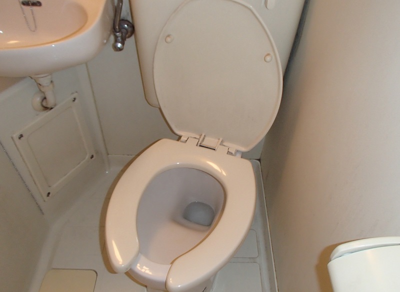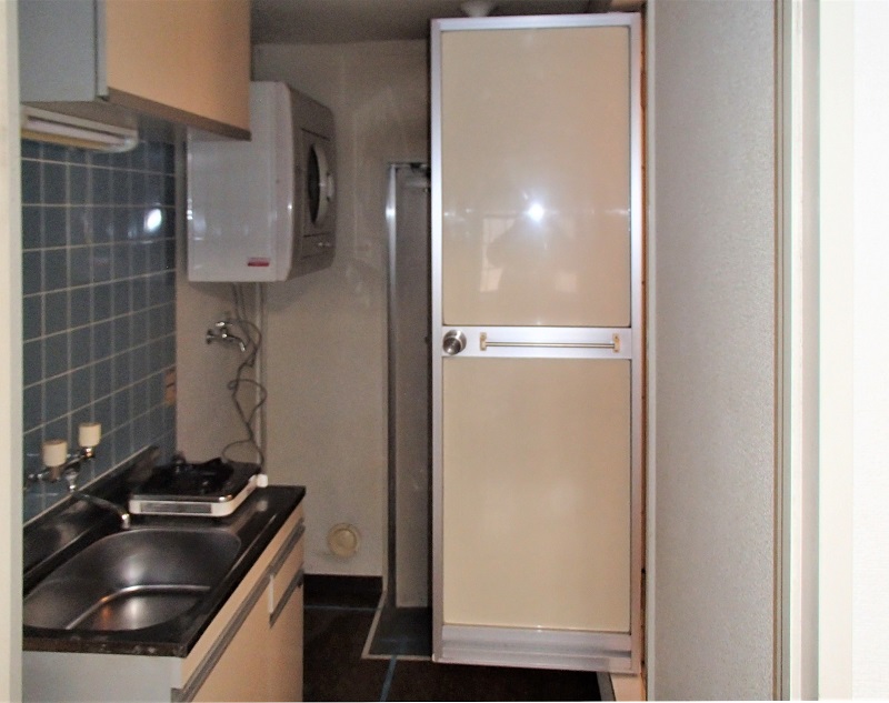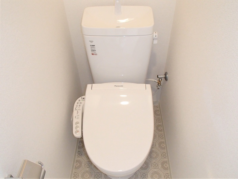 三点式ユニットバスはシャワーブースとトイレ(温水洗浄便座付き)に 床のレトロなタイル柄もポイントです
