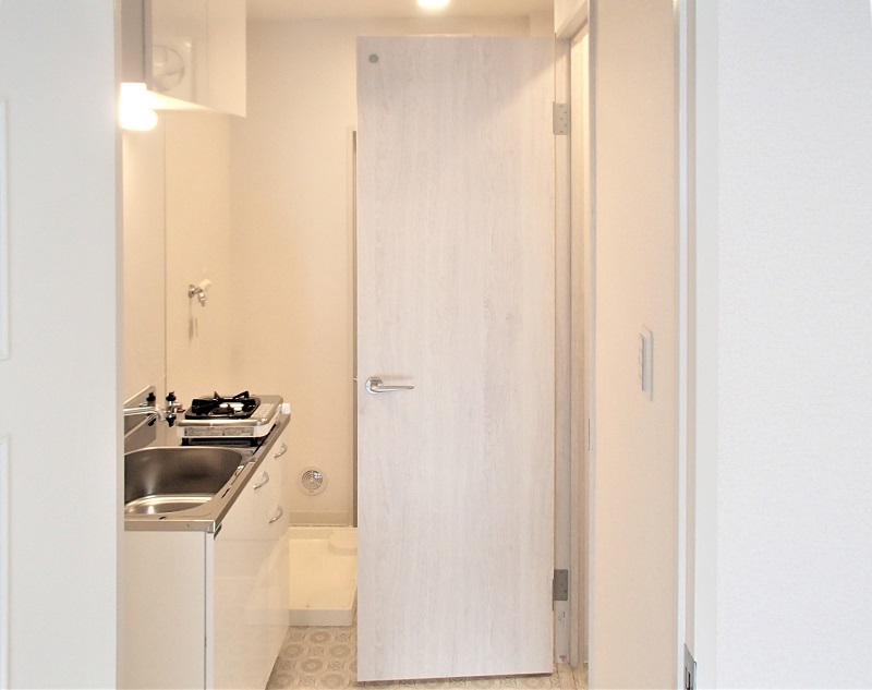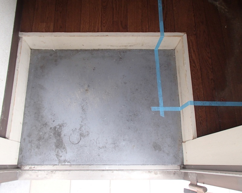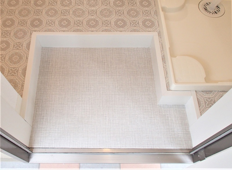 玄関は一部をけずって洗濯防水パンを新設 こうして玄関先のスペースも活用しています