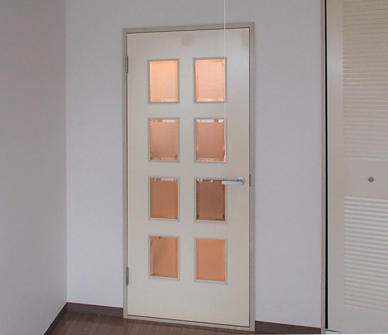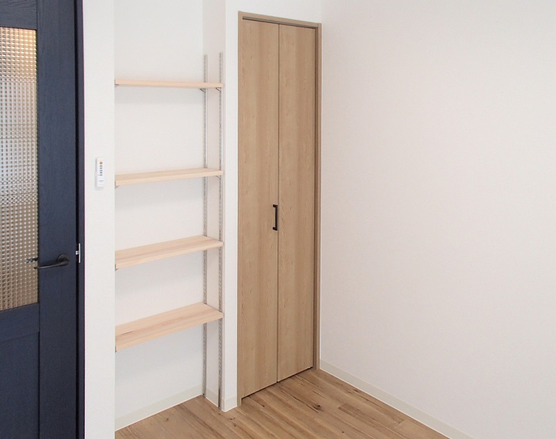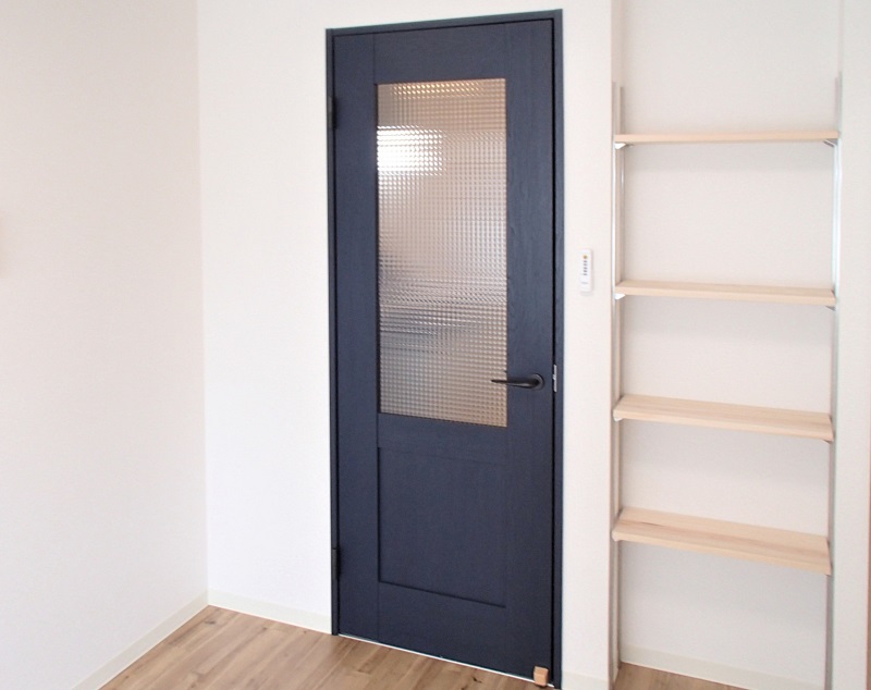 居室の扉はあえてカラー扉にして変化を 隣の棚にインテリア小物や観葉植物を飾ってもよさそうです