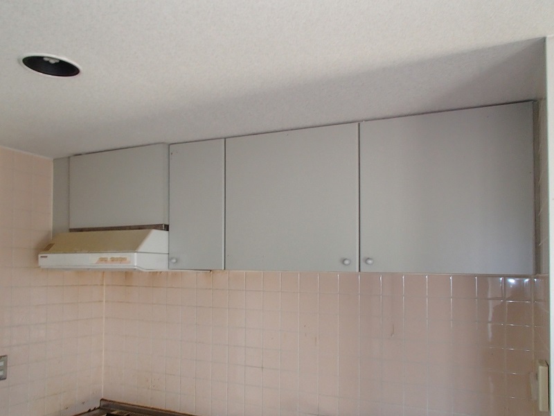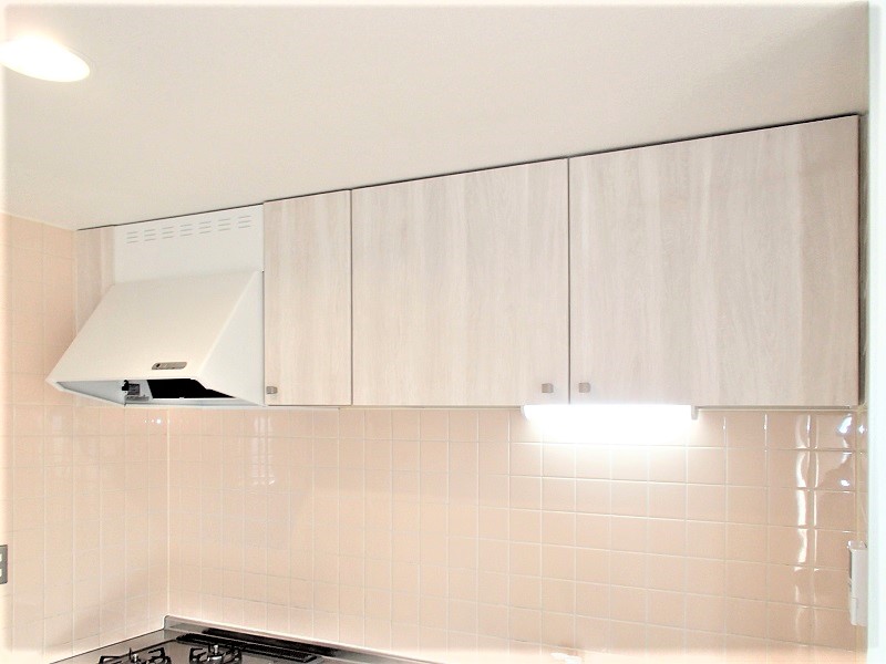 レンジフードは淡い色みに合わせてホワイトに新調◎ 吊り戸棚は流し台と同じ木目で揃えました