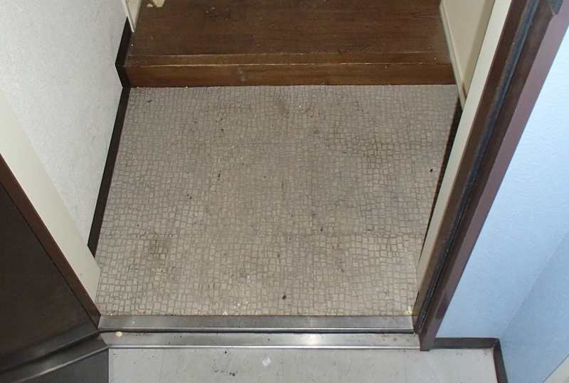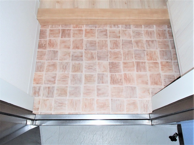 玄関の土間部分は優しい色みの床材に合わせ、 明るいタイル調にしています